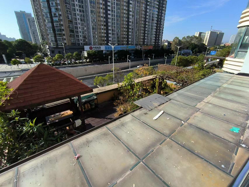 11月28日,熊先生帶記者來到了他位于江信國際花園1棟C單元4層的住宅。利用商鋪突出的樓頂部分,3樓住戶搭建出了一個帶陽光房的“小花園”。記者一進熊先生家,一眼便能望到3樓陽光房的房頂。冬日正午的陽光,經(jīng)過陽光房反射,明晃晃地射入熊先生家客廳。“冬天還好,到了夏天的時候,由于陽光反射,陽臺的溫度特別高。”熊先生抱怨道,到了雨天,陽光房又變成了一只“大鼓”,雨點落在玻璃上,“噼里啪啦”響個不停,嚴重影響休息。